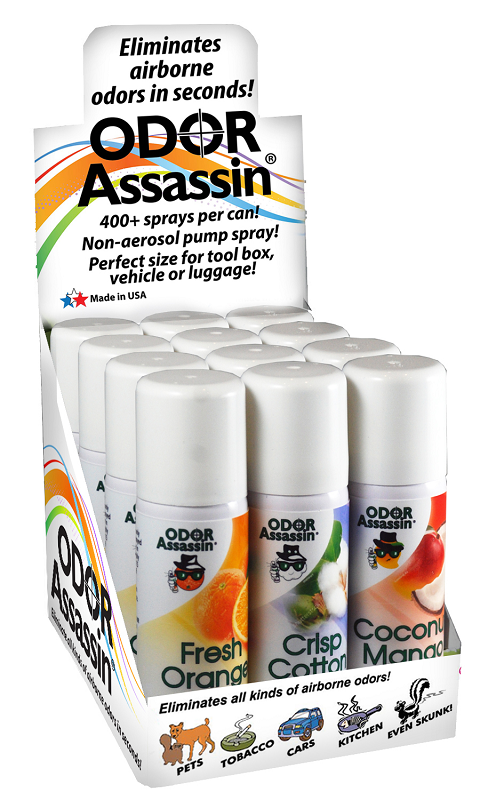 The little 2.2 oz. cans are sized to carry with you wherever you go. Non-aerosol pump spray delivers more than 400 sprays per can and makes it travel friendly. Perfect for the Toolbox, Vehicles, Purse or Luggage. Display pre-packed with 4 cans of each Fresh Orange, Crisp Cotton & Coconut Mango​ scent.
